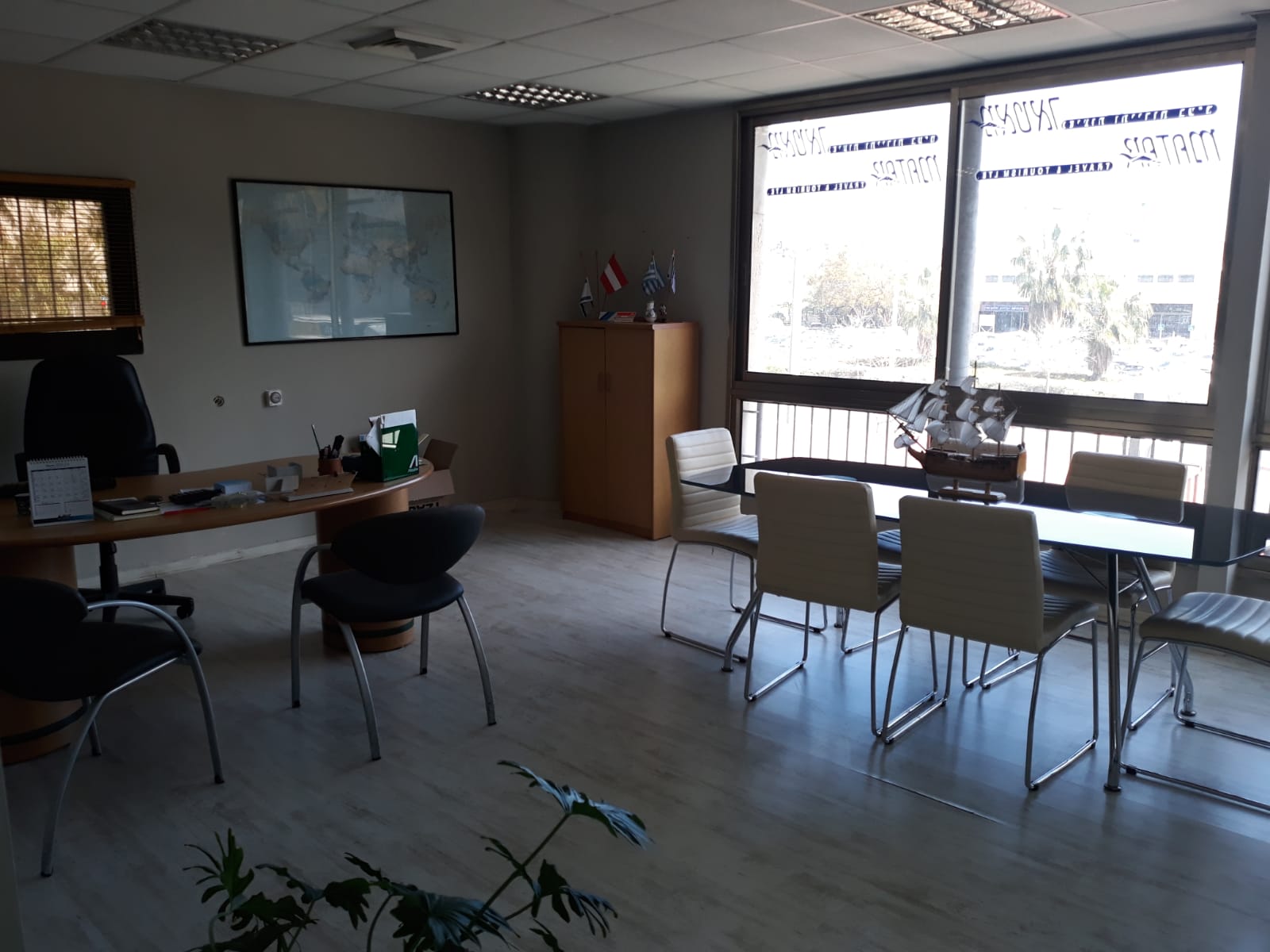 משרד מסודר עם נוף לנמל חיפה עם חלל עבודה משותף וחדר מנהל, מיטבחון ושירותים.